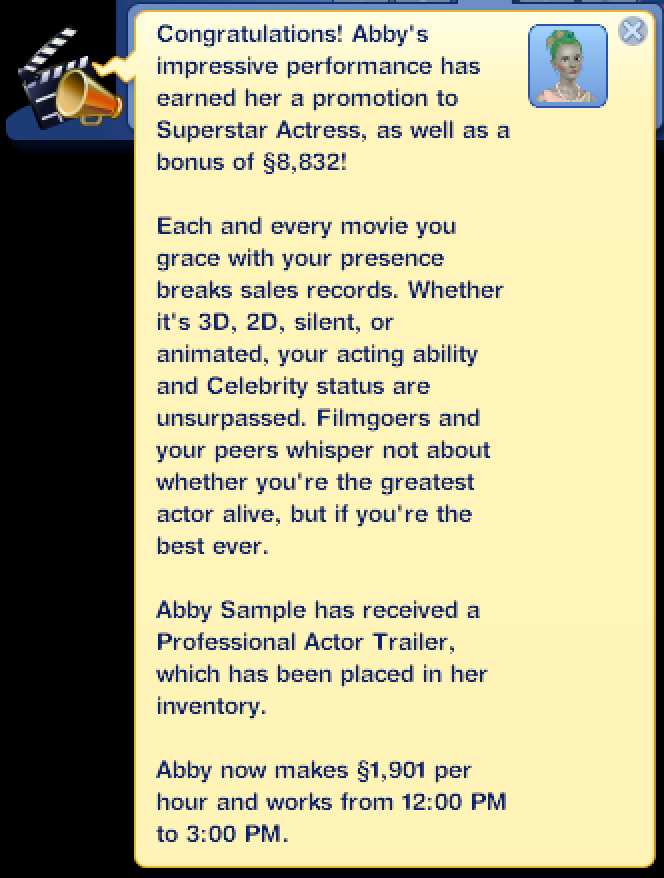 Abby did actually get the Simmy for Best Actress. I ended up playing the award ceremony twice due to a game crash. The first time she got a third-place award of some kind. The second time she got the Simmy. So, it was just random, but still nice.